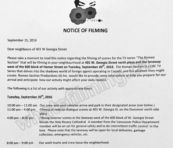 The Romeo Section Filming Notice September 20, 2016 at 401 W Georgia St in Vancouver