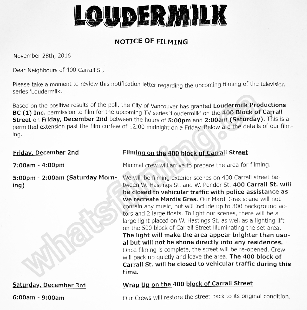 Loudermilk Filming Notice December 2, 2016 at 400 Carrall St in Vancouver