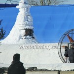 In the centre of the action is a mound of fake snow and what looks like the remains of a woolly mammoth. At the top of the mound is a snow/ice sculpture that looks similar to an Inuksuk. This morning they were blowing some fake snow through a massive fan onto the set. Off to the side is another smaller set with trees covered in fake snow. There’s similar tundra-looking set that they have built in-studio as well.